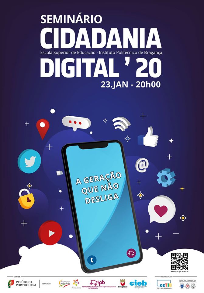O ccTIC ESE/IPB em colaboração com a União das Freguesias da Sé Santa Maria e Meixedo estão a organizar o Seminário Cidadania Digital’20 – A Geração Que Não Desliga, a realizar no dia 23 de janeiro de 2020, com início às 20h00, no auditório da Escola Superior de Educação de Bragança. O Evento enquadra-se no âmbito do programa de promoção da Cidadania Digital Responsável, do Ministério da Educação DGE/ERTE.