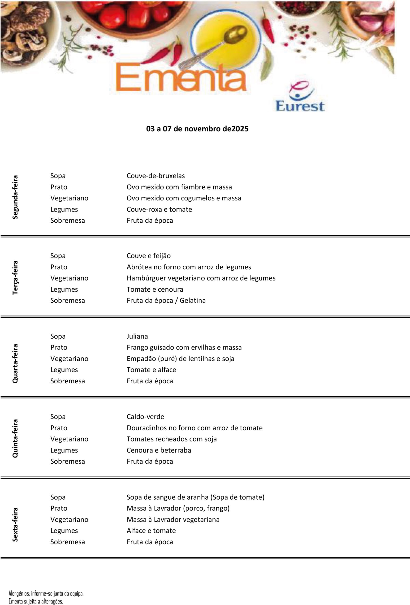 Ementa para a semana de 03 a 07 de novembro de 2025.
