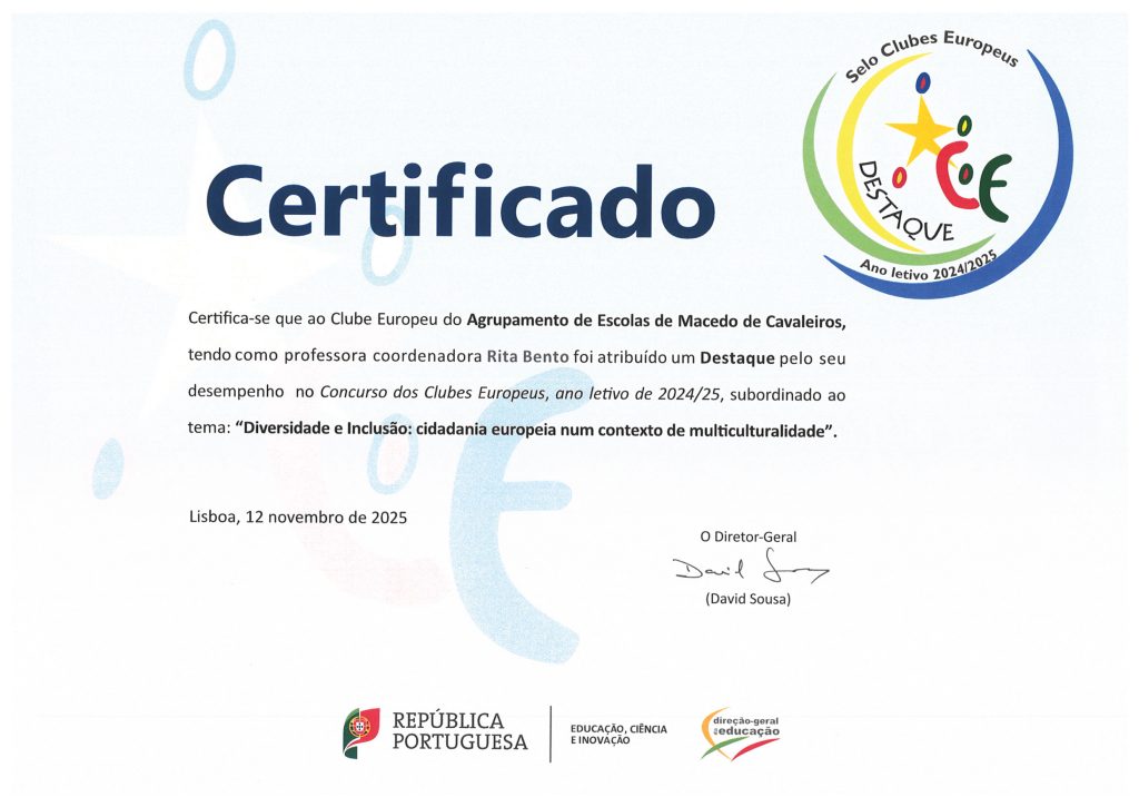 Certificado Clube Europeu do Agrupamento de Escolas de Macedo de Cavaleiros no ano letivo 2024/2025.
