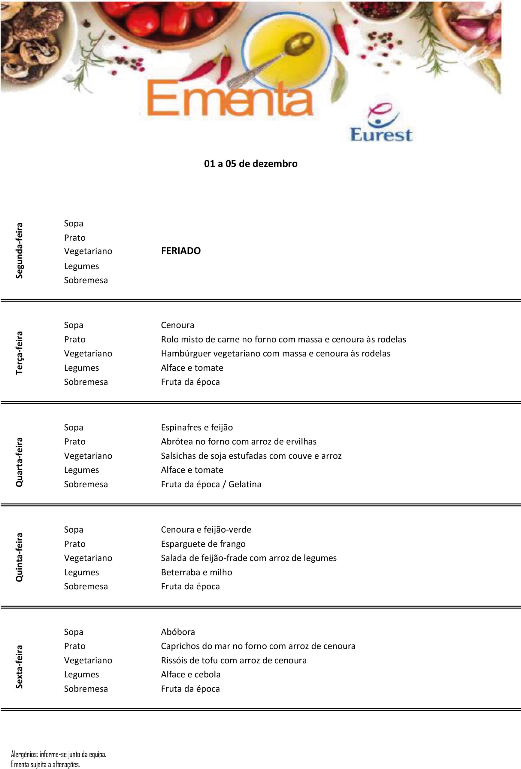 Ementa para a semana de 01 a 05 de dezembro de 2025.