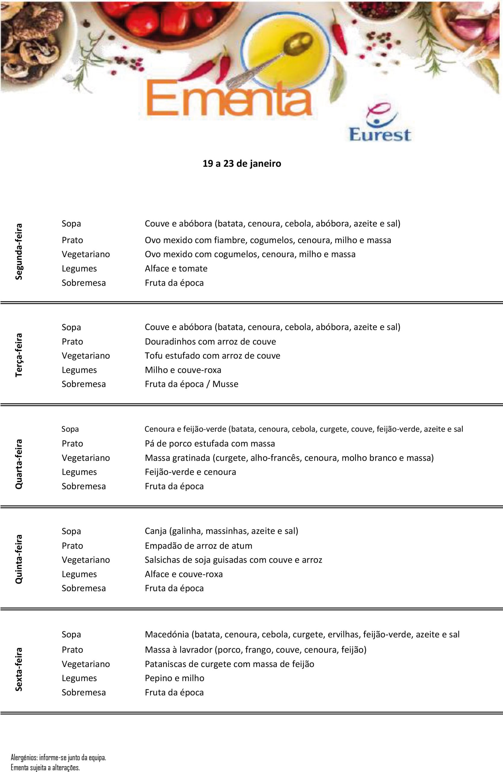 Ementa Semanal 19/01 — 23/01