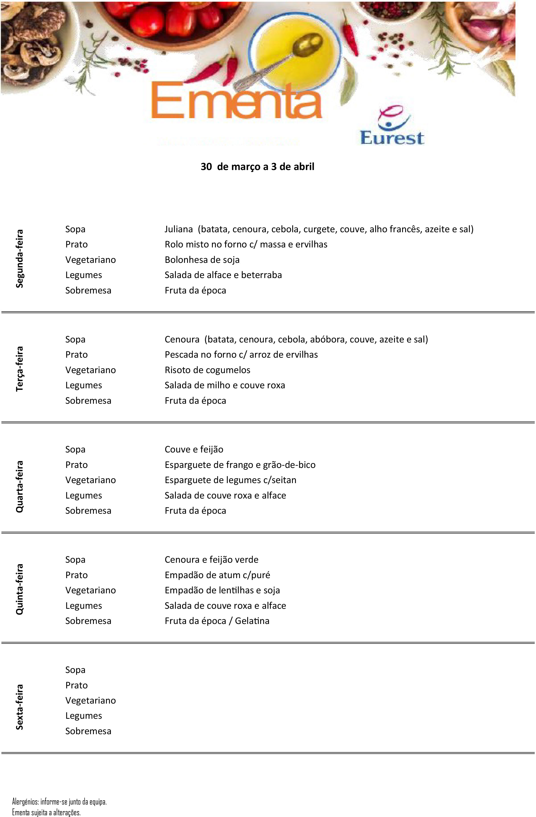 Ementa para a semana de 30 de março a 3 de abril de 2026.