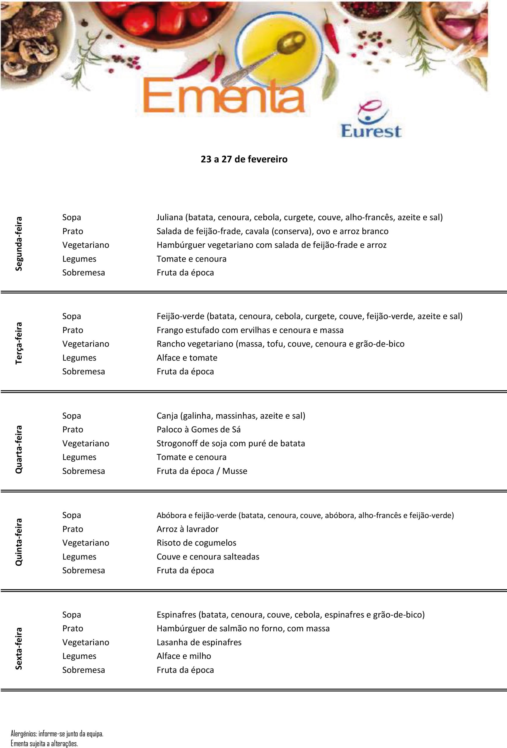 Ementa para a semana de 23 a 27 de fevereiro de 2026.