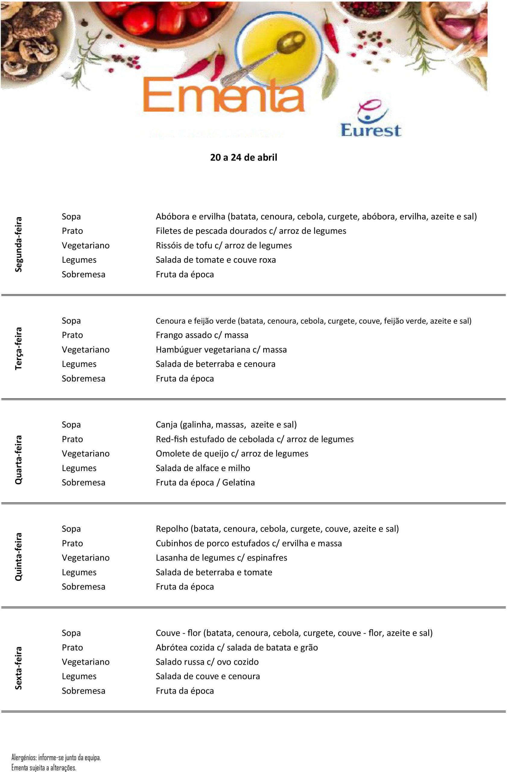 Ementa para a semana de 20 a 24 de abril de 2026.