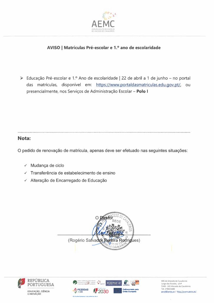 Aviso – matrículas 1.º ano de escolaridade